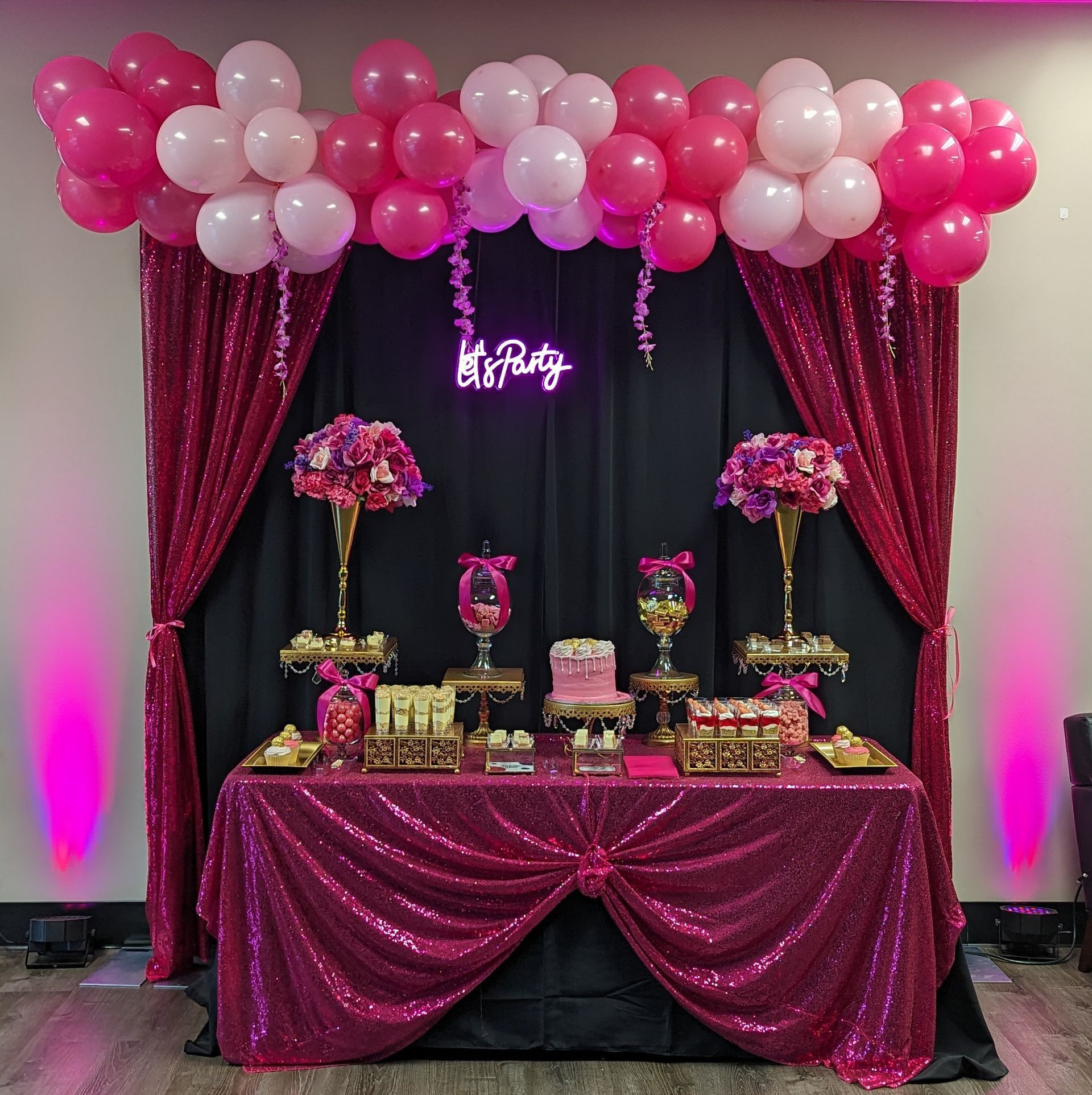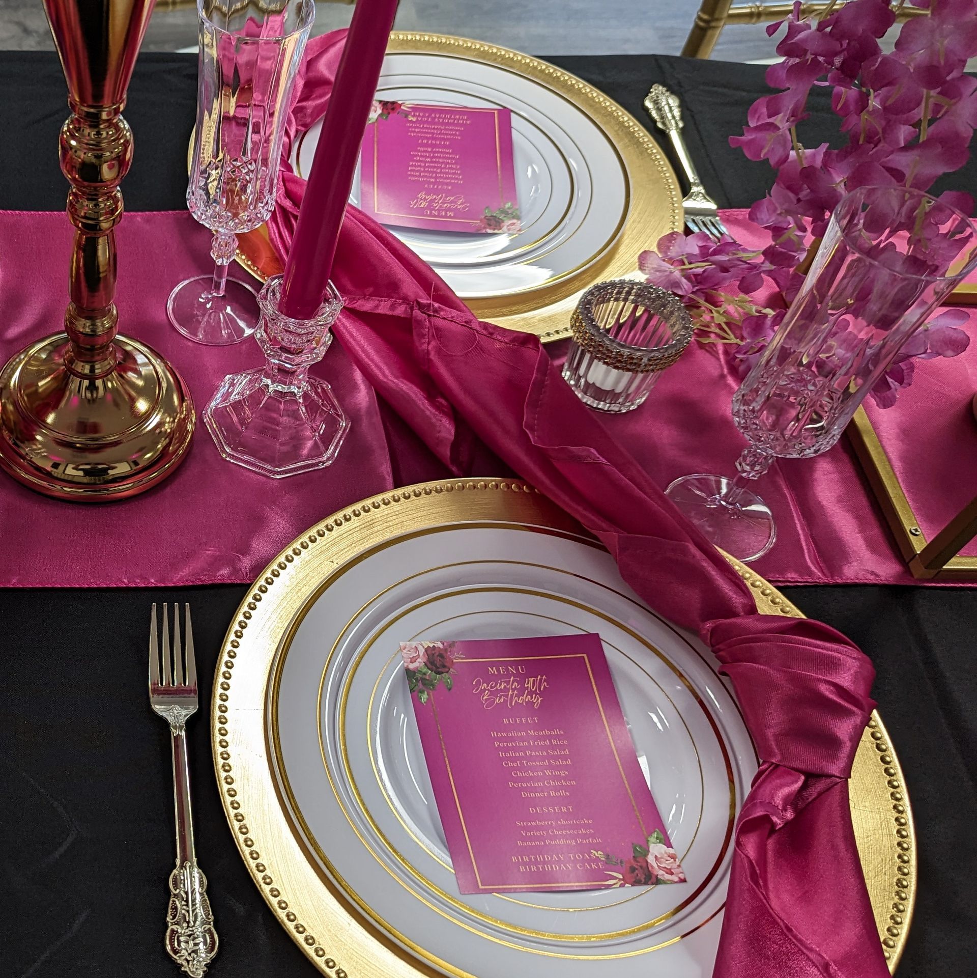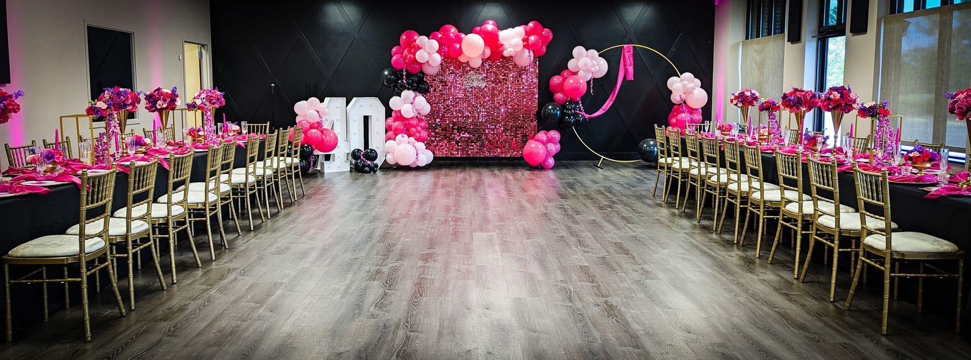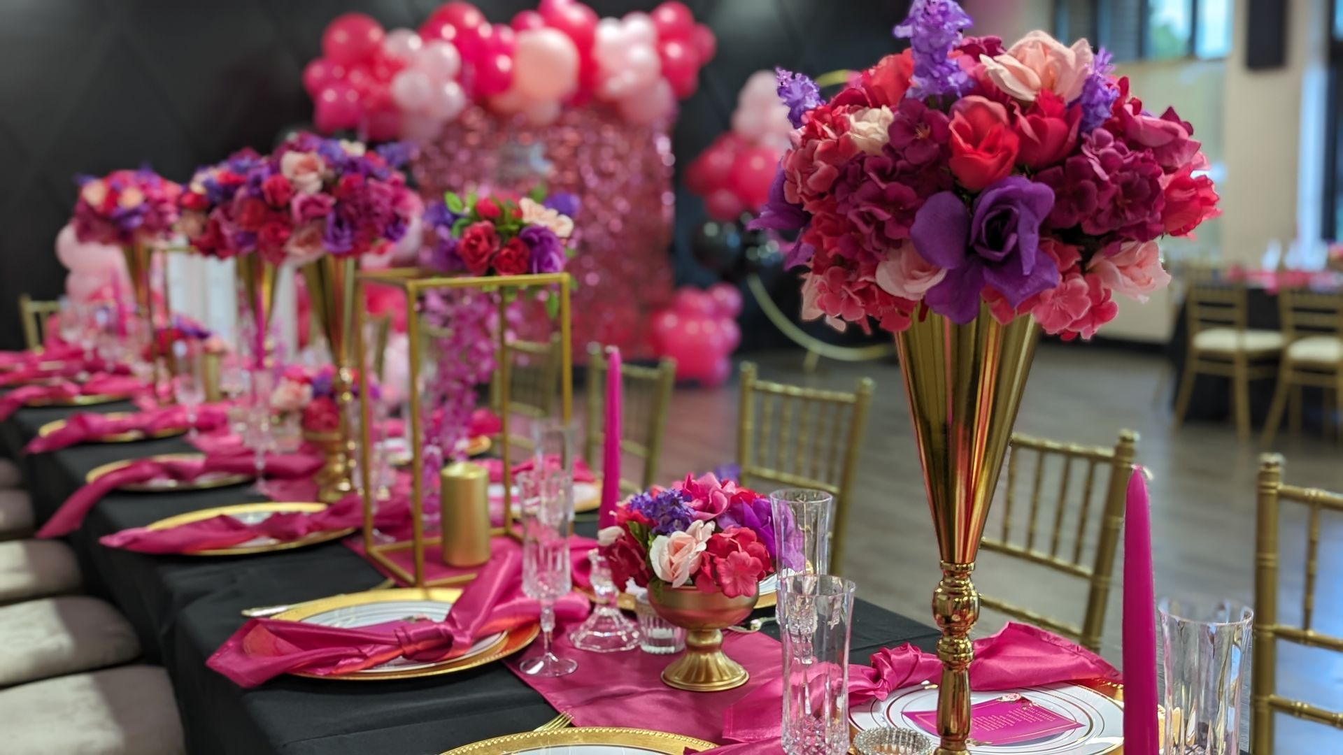 Elegant hand-crafted throne chairs, gold centerpieces and chargers, lit marquee numbers, and more are available to add charm to your event.
